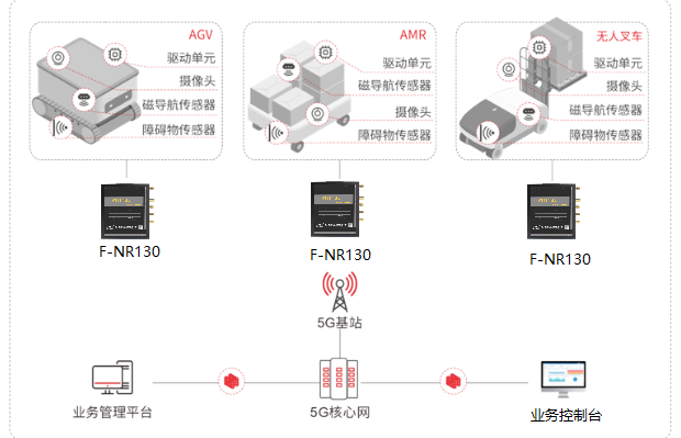 在插取式、移載式、托盤式等不同類型的AGV/AMR、無人叉車設(shè)備上內(nèi)置5G 路由F-NR130,利用5G LAN進(jìn)行二層通信,將不同的物流倉儲(chǔ)機(jī)器人組進(jìn)同一張網(wǎng)。通過四信提供的工業(yè)5G路由F-NR130連接AGV導(dǎo)航定位系統(tǒng)、驅(qū)動(dòng)控制系統(tǒng),實(shí)現(xiàn)小車和管理平臺(tái)之間數(shù)據(jù)交互,并不斷把AGV工作現(xiàn)場(chǎng)路況、位置等無人物流車運(yùn)動(dòng)軌跡視頻圖像信息實(shí)時(shí)傳輸?shù)皆贫?,進(jìn)行處理分析,同時(shí)運(yùn)營(yíng)管理平臺(tái)可實(shí)現(xiàn)遠(yuǎn)程對(duì)VGA小車管理控制和運(yùn)維監(jiān)控,充分降低倉儲(chǔ)管理系統(tǒng)應(yīng)對(duì)繁瑣協(xié)議解析對(duì)接的難度,可實(shí)現(xiàn)設(shè)備狀態(tài)和庫存信息與倉儲(chǔ)管理系統(tǒng)的對(duì)接。