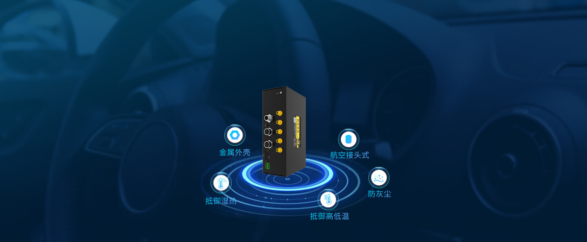 堅固的金屬外殼,防護等級IP40,可抵御水濺、灰塵,沖擊、振動、濕熱、高低溫等環(huán)境壓力;設備電源、網口采用航空接頭式,連接牢固,滿足車載應用環(huán)境。
