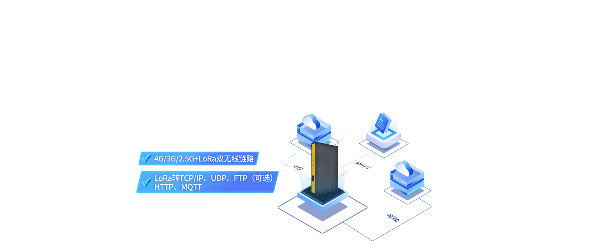 LoRa數(shù)據(jù)可轉(zhuǎn)4G、有線、WiFi等傳輸方式;網(wǎng)關(guān)支持4G/3G/2.5G+LoRa雙無線鏈路、