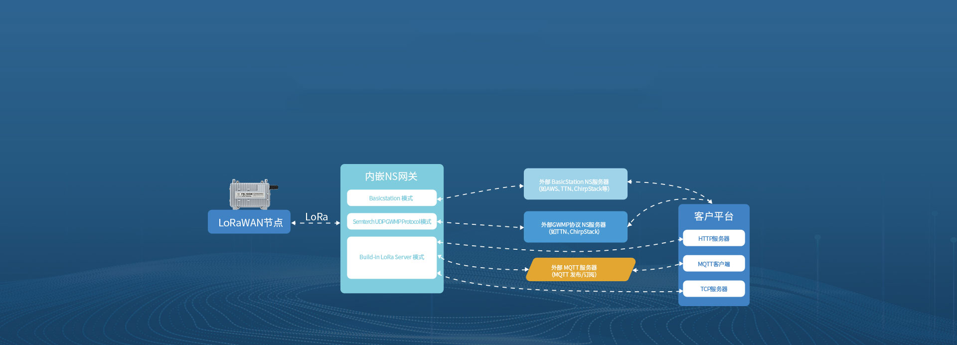 網(wǎng)關(guān)支持多種模式,分別為內(nèi)嵌Network Server模式(Network Server部署在網(wǎng)關(guān)內(nèi)部)