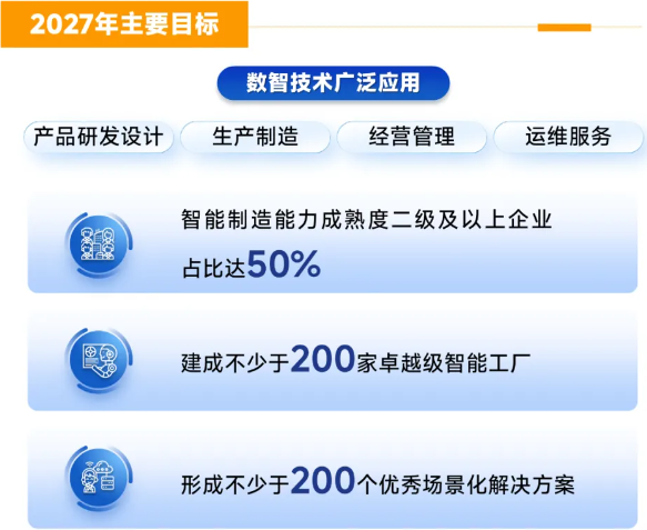 《方案》提出,到2027年,數(shù)智技術(shù)在產(chǎn)品研發(fā)設(shè)計(jì)、生產(chǎn)制造、經(jīng)營(yíng)管理、運(yùn)維服務(wù)等環(huán)節(jié)廣泛應(yīng)用,智能制造能力成熟度二級(jí)及以上企業(yè)占比達(dá)50%,建成不少于200家卓越級(jí)智能工廠,帶動(dòng)機(jī)械企業(yè)研發(fā)設(shè)計(jì)、生產(chǎn)制造、供應(yīng)鏈管理數(shù)字化智能化水平穩(wěn)步提升;培育一批既懂行業(yè)又懂?dāng)?shù)字化的系統(tǒng)解決方案供應(yīng)商,形成不少于200個(gè)優(yōu)秀場(chǎng)景化解決方案,服務(wù)能力顯著增強(qiáng)。