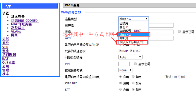 2、4G撥號上網(wǎng)連接類型默認dhcp-4G或使用3G/UMTS/4G/LTE。