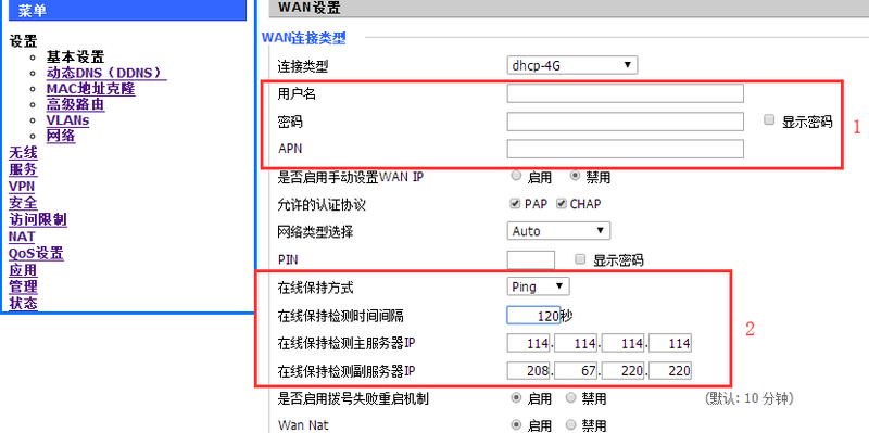 專網(wǎng)手機卡:在紅框1部分填寫運營商提供的專網(wǎng)信息,包括用戶名密碼或APN號。