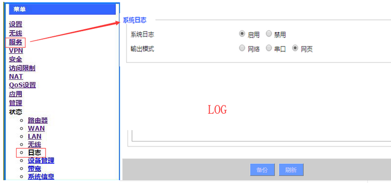 6、日志輸出。在“服務(wù)”下面啟用系統(tǒng)日志,選擇“網(wǎng)頁”輸出后點“保存”