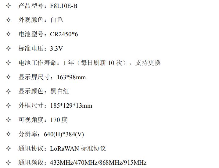 功能特點 超長傳輸距離,覆蓋范圍廣 多種安裝方式,應(yīng)用范圍廣 7.5寸低功耗三色電子墨水屏 電池供電,無需布線,即裝即用 專利化的通訊機制,攻克實時傳輸難題 完善的設(shè)備管理平臺,快速對接,省時省力